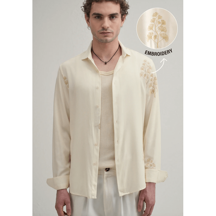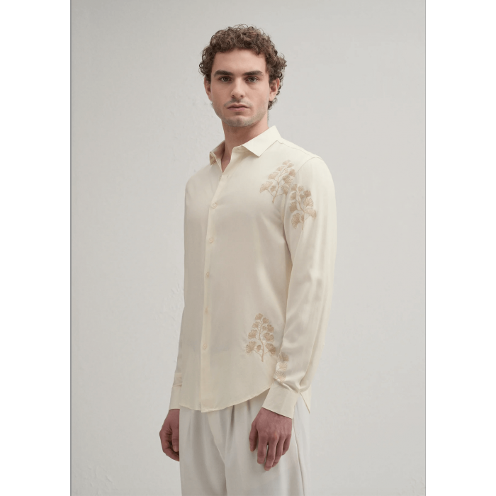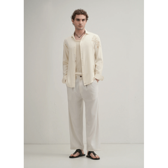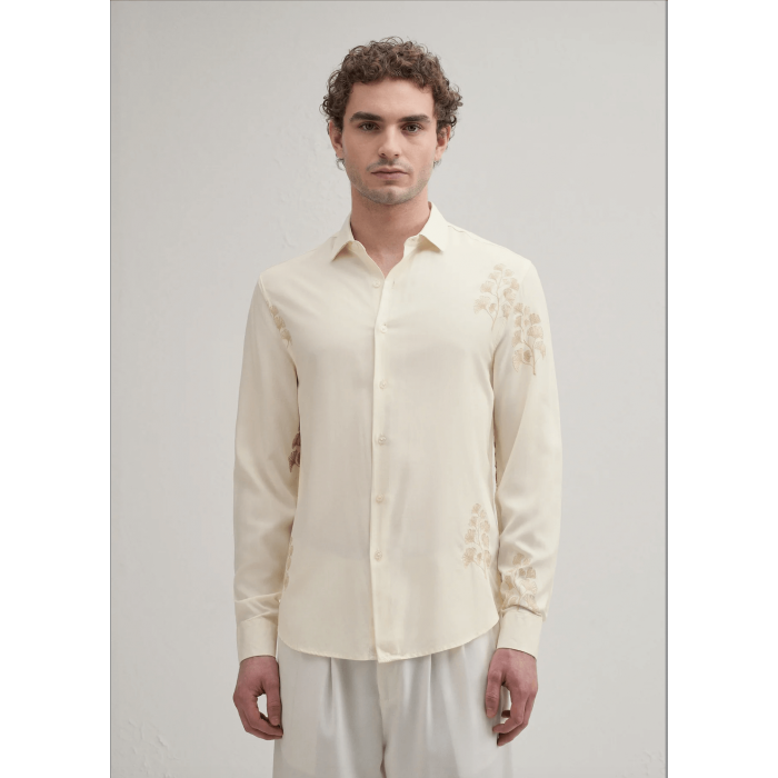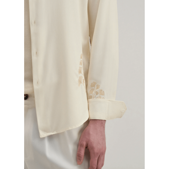 This long-sleeve button-up shirt features evenly spaced all-over embroidery and a classic pointed collar for a refined look. Crafted from a lightweight blend of 55% Tencel and 45% viscose, it offers a relaxed drape and breathable comfort. The curved hemline adds a casual touch, making it versatile for both laid-back and smart-casual outfits.