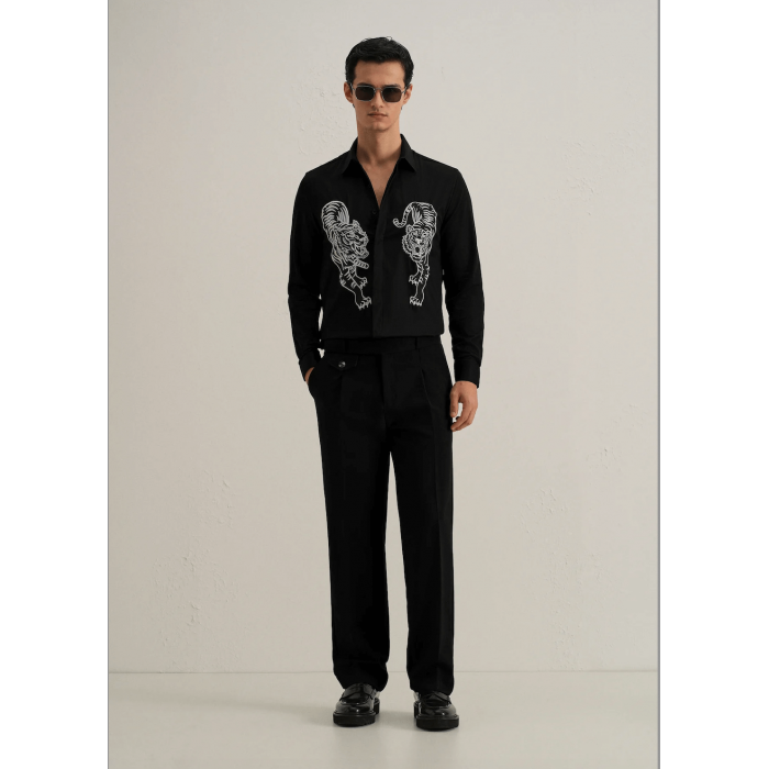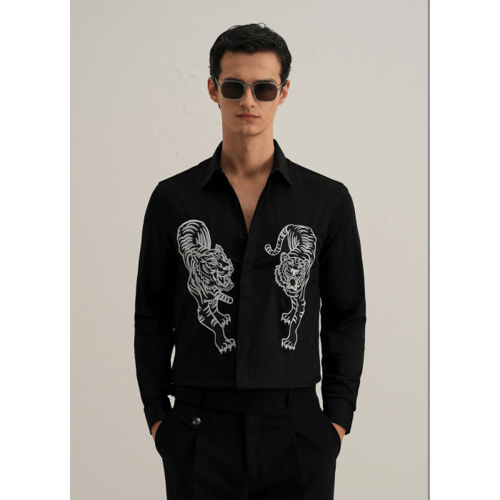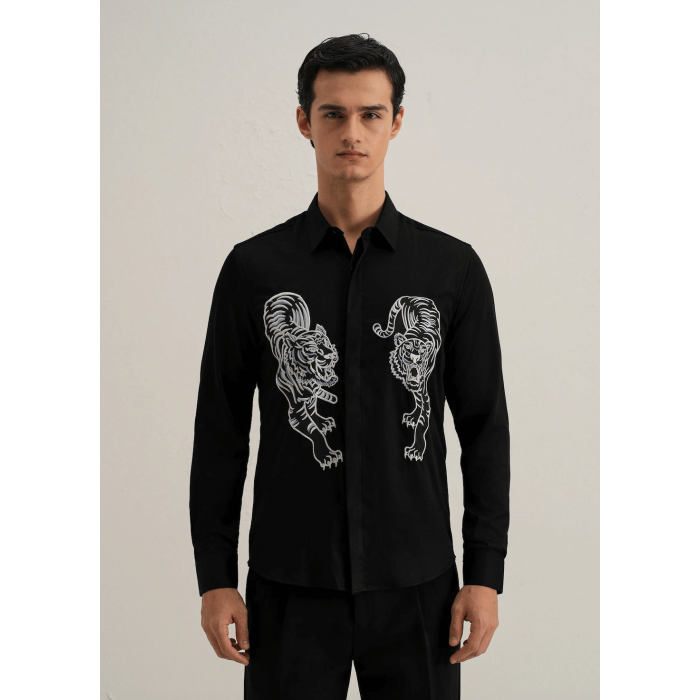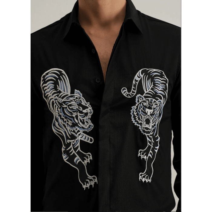 Make a bold statement with this Designer full-sleeve shirt featuring striking twin tiger embroidery on the front. Crafted from premium fabric, this shirt combines sleek with eye-catching design details. The intricate tiger motifs add a touch of fierceness and individuality. Designed with a classic spread collar and button-down closure, it offers both comfort and a refined silhouette.